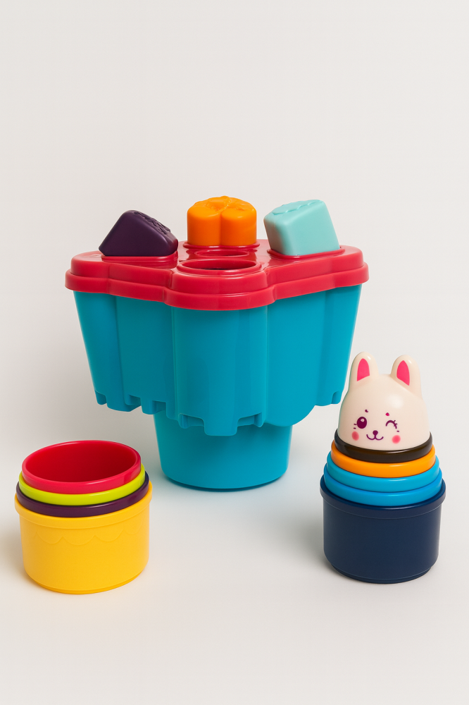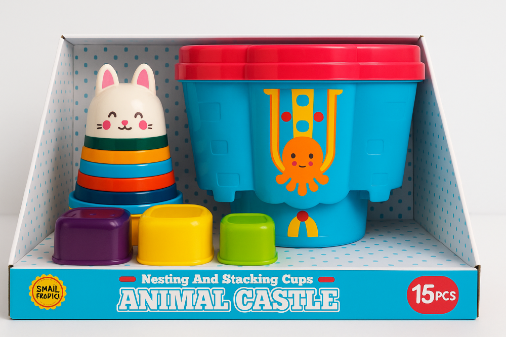 🏰 مجموعة مكونة من 15 قطعة (أكواب ملوّنة + أشكال حيوانات).